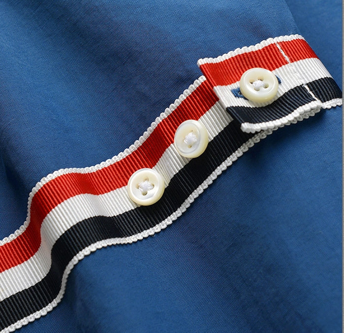 Front button closure with striped grosgrain placket
